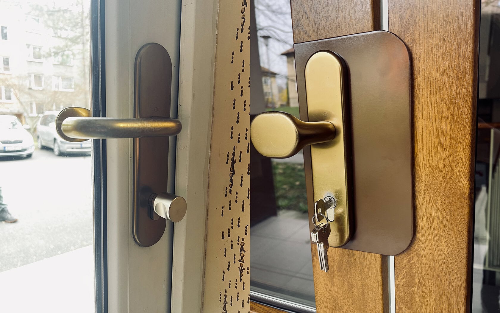 Zabezpečil jsem starší dveře proti vypáčení pomocí krycích plechů z masivní oceli a nainstaloval nové bezpečnostní vložky, které fungují na jeden klíč pro oba vchody. Zevnitř se zamykají pohodlně pomocí knoflíku. Ideální řešení pro společné prostory.